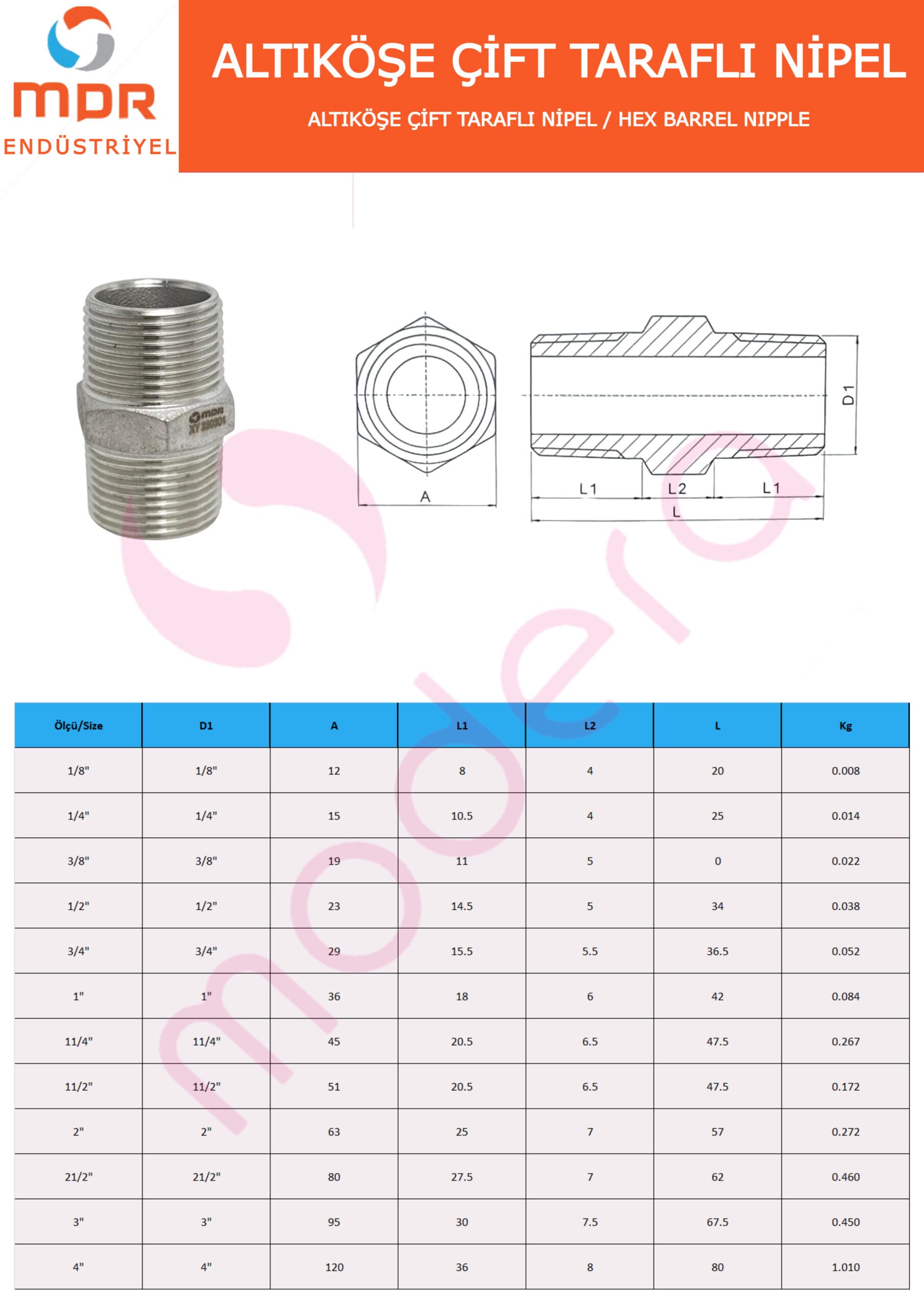 Sanayi tesisleri, su ve gaz tesisatları, kimya, gıda ve içecek sektörlerinde yaygın olarak kullanılan altı köşe çift taraflı hex nipel.