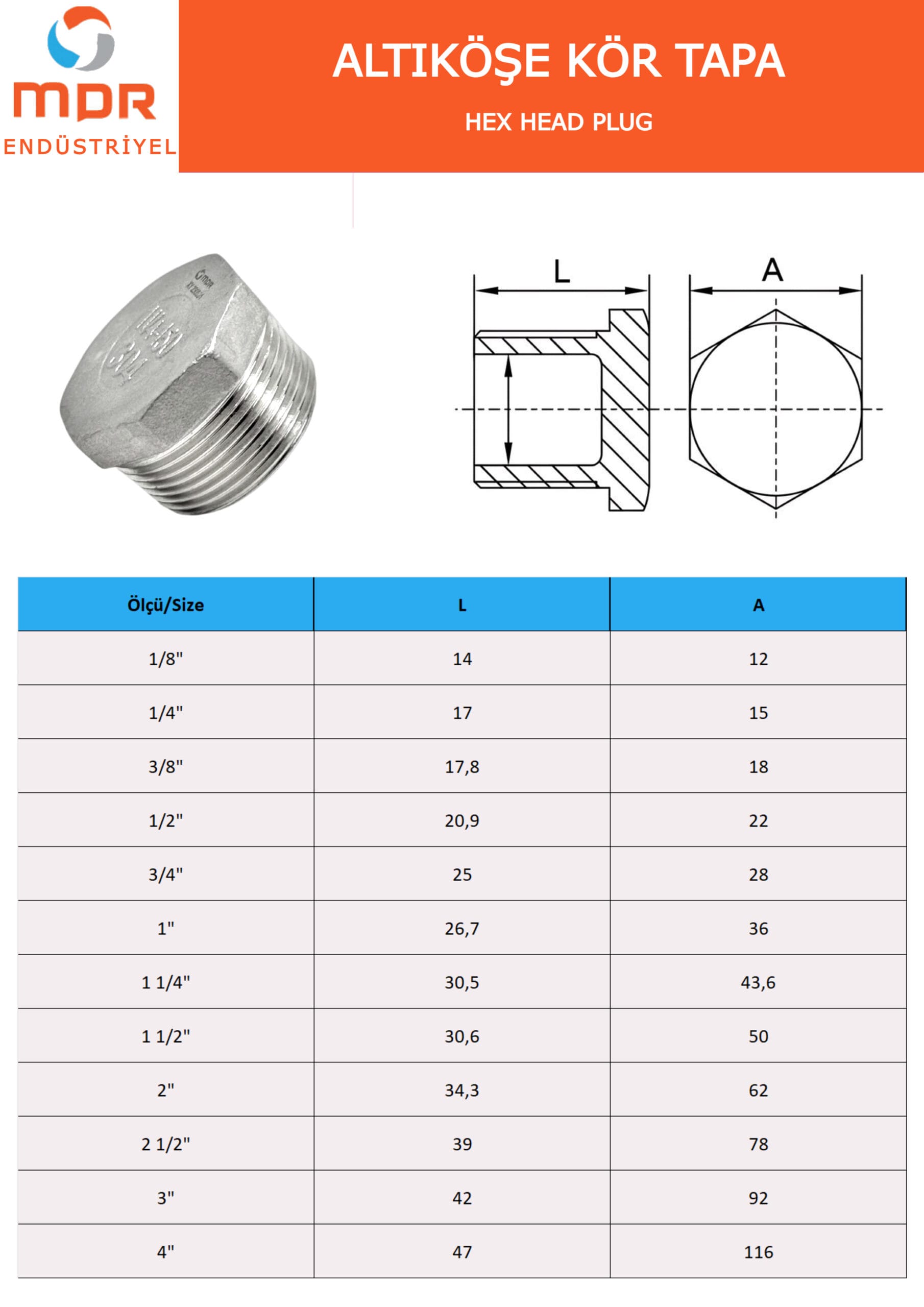 Yüksek kaliteli AISI 304 / 316L paslanmaz çelikten üretilen Altıköşe Kör Tapa, mükemmel korozyon direnci ve pürüzsüz, hijyenik yüzey yapısı ile gıda, içecek, ilaç ve kimya gibi hassas endüstrilerde kullanım için idealdir.